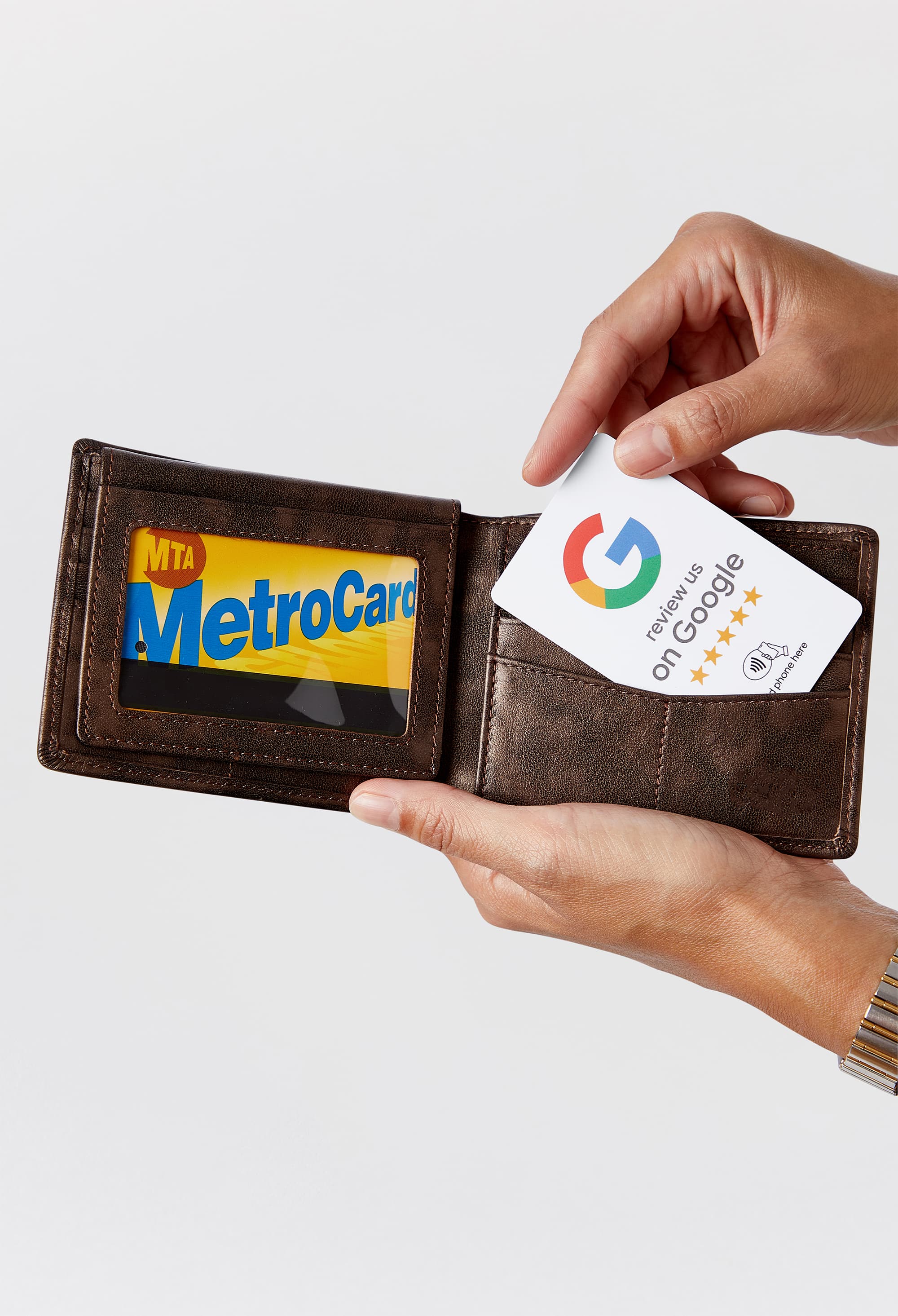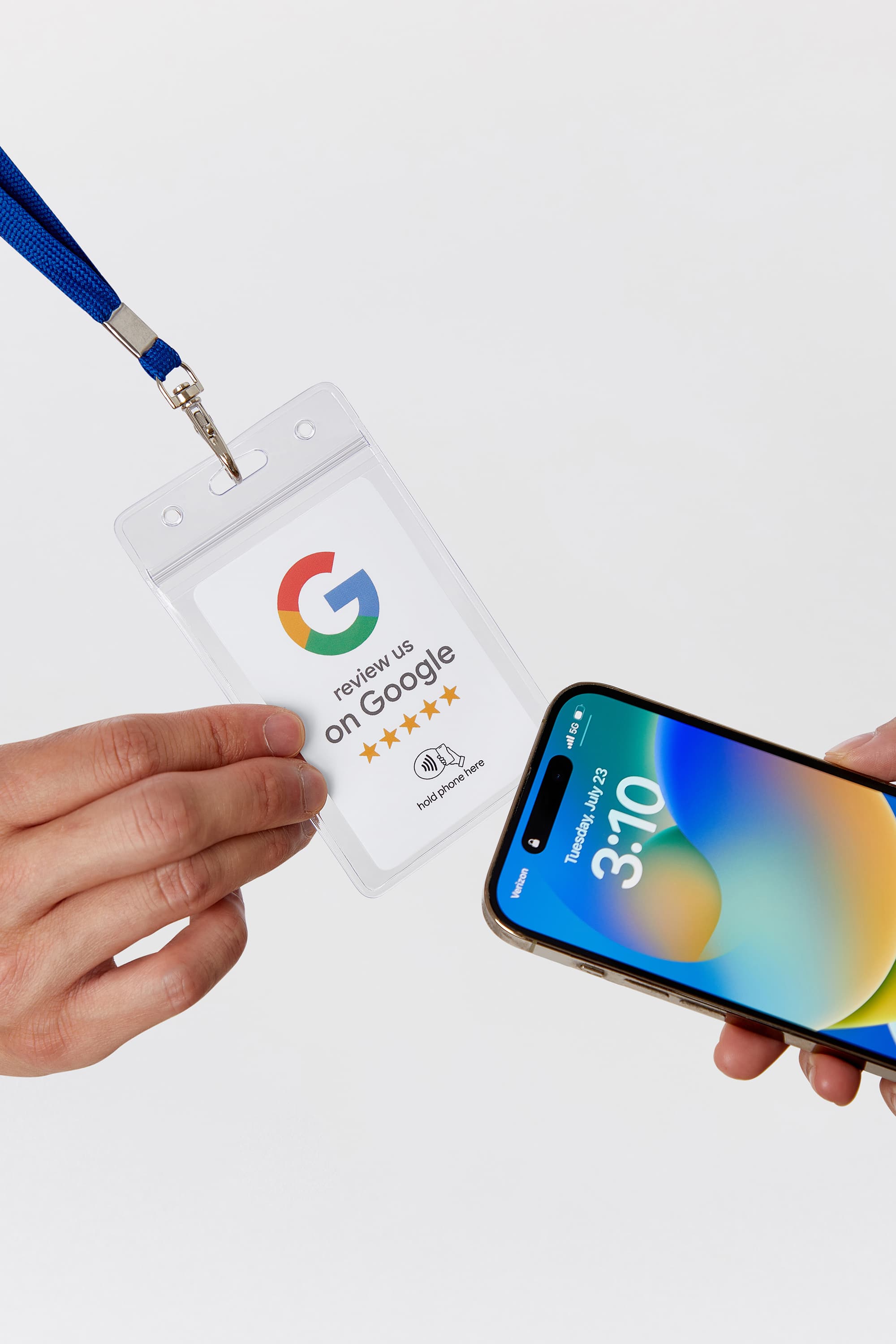 You get a kit of 25 NFC + QR code badges for each of your employees. Have your staff ask for a review when the customer is happy, and they tap or scan to leave one on Google in seconds.
